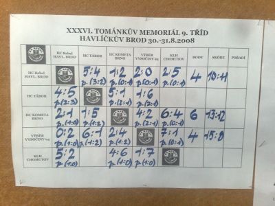 právě ta byla soupeřem domácího týmu v prvním utkání. Hosté z Brna se díky perfektnímu výkonu brankáře Richarda Čiliaka radovali z těsné výhry 2:1 a notně tak narušili plány Rebelů na obhajobu. V dalším utkání hráči z Brna prohrávali s Chomutovem již 0:3, avšak díky bojovnosti celého týmu dokázali utkání zvrátit a výhrou 6:4 se rázem stali aspiranty na trofej. Vynikající výsledek pak podtrhli výhrou 4:2 nad výběrem Vysočiny. Již před posledním utkáním tak bylo jasno - Kometa se stane vítězem tohoto turnaje a poprvé v jeho bohaté historii jej přiveze do Brna! Nic na tom nezměnila ani závěrečná prohra s Táborem v poměru 1:5. Cenný pohár byl předán primátorkou Havlíčkova Brodu do rukou brněnských nadějí. Podívejte se pozorně na jména pod fotografií. Možná za pár let ta stejná jména uvidíte na soupisce "A" týmu brněnské Komety... Velká gratulace vítězům!