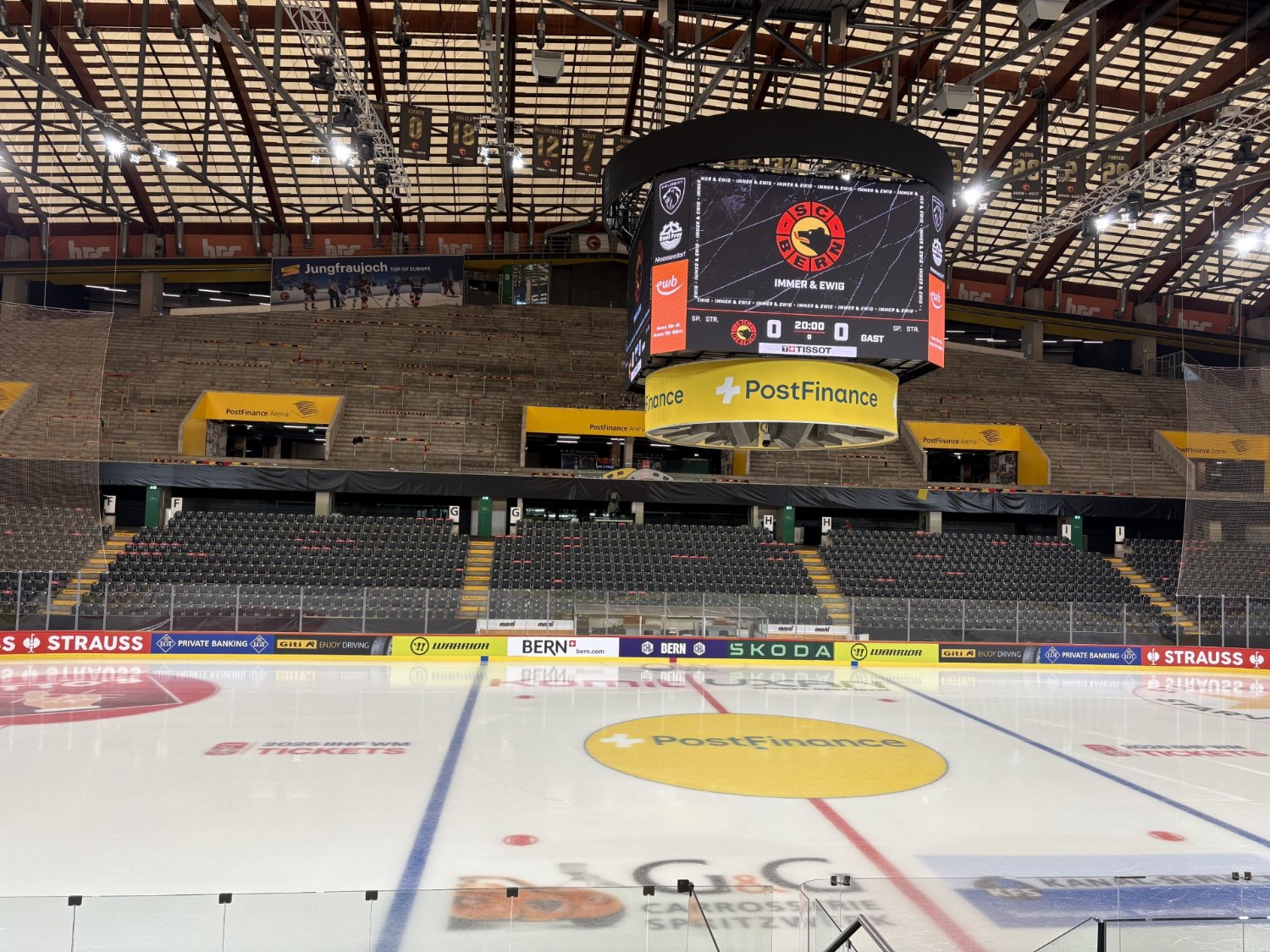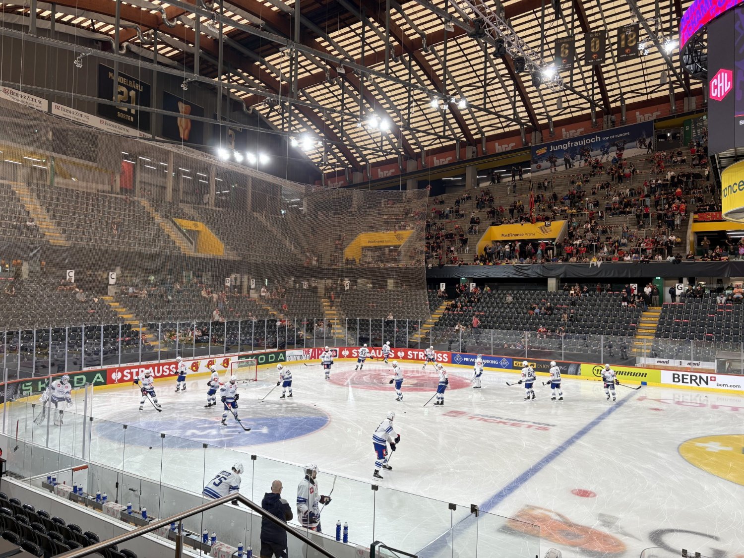 🕰 15:00 Hokejisté jsou již v Post Finance Areně, která pojme více jak 17 tisíc fanoušků. Probíhá příprava na sucho, v 16:00 jdou hráči na led.