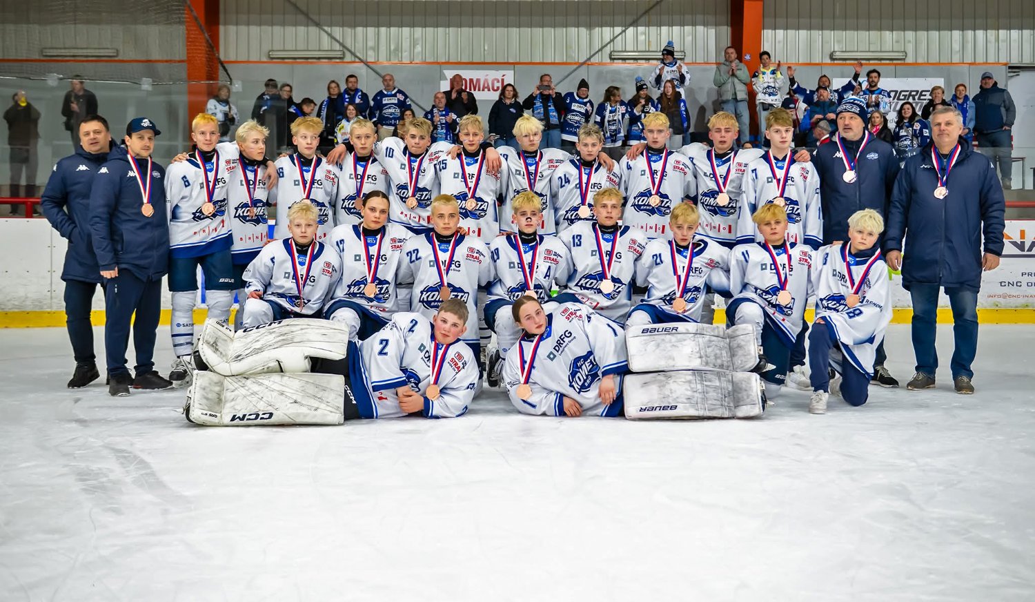 Junioři Komety předvedli stříbrné medaile před vyprodanou KAJOT ARENOU den po jejich zisku. Na led totiž nastoupili společně s A týmem před 4. zápasem sefimifinále s Plzní