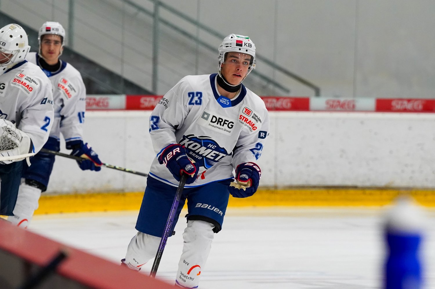 Poslední třetina začala pro brněnské juniory naprosto ideálně. Po tlaku soupeře se do přečíslení tři na jednoho vydal Dominik Halačka a prudkou střelou ke vzdálenější tyči prostřelil Čelka. Jeden z klíčových momentů nastal ve 46. minutě, kdy Hrček ve velké šanci trefil tyčku. Kometa si už ve zbytku utkání velmi zkušeným výkonem pohlídala a hlavně navýšila vedení. V 56. minutě využil možná mírné nepozornosti Čelka u pravé tyče Tomáš Selič a bekhandem propasíroval puk u tyče. Konečnou tečku za vítězným zápasem ve Vyškově udělal Jaroslav Prchal, který si našel odražený puk mezi kruhy a pohotově dorazil.