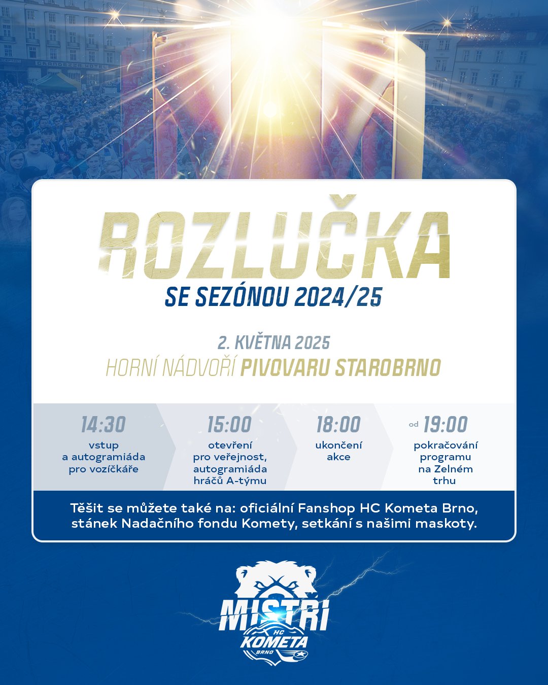 Fanoušci se v areálu pivovaru mohou těšit na autogramiádu hráčů Komety se speciálními kartičkami vyrobenými právě pro tuto příležitost. Rovněž se zde mohou vyfotit hned se třemi Masarykovými poháry, které Brňané v letech 2017, 2018 a naposledy v úterý večer vybojovali.