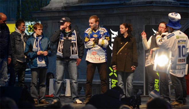 Marketingová ředitelka Komety Hana Novotná po první třetině přijela na náměstí Svobody, z pódia pozdravila všechny fanoušky, v krátkém rozhovoru pověděla, jaká je atmosféra v KAJOT ARENĚ, pomohla s rozhozem triček od Komety s tématikou a nálepkou play-off a hlavně sledovala, jak letí do publika pět tenisáků. Tři nejrychlejší, co tenisák přinesli na pódium, měli být výherci exklusivní cesty přímo na stadion. Ovšem odcestovali nakonec jen dva, protože mladá slečna si cestu na poslední chvíli rozmyslela a na hledání dalšího výherce už nebyl čas.