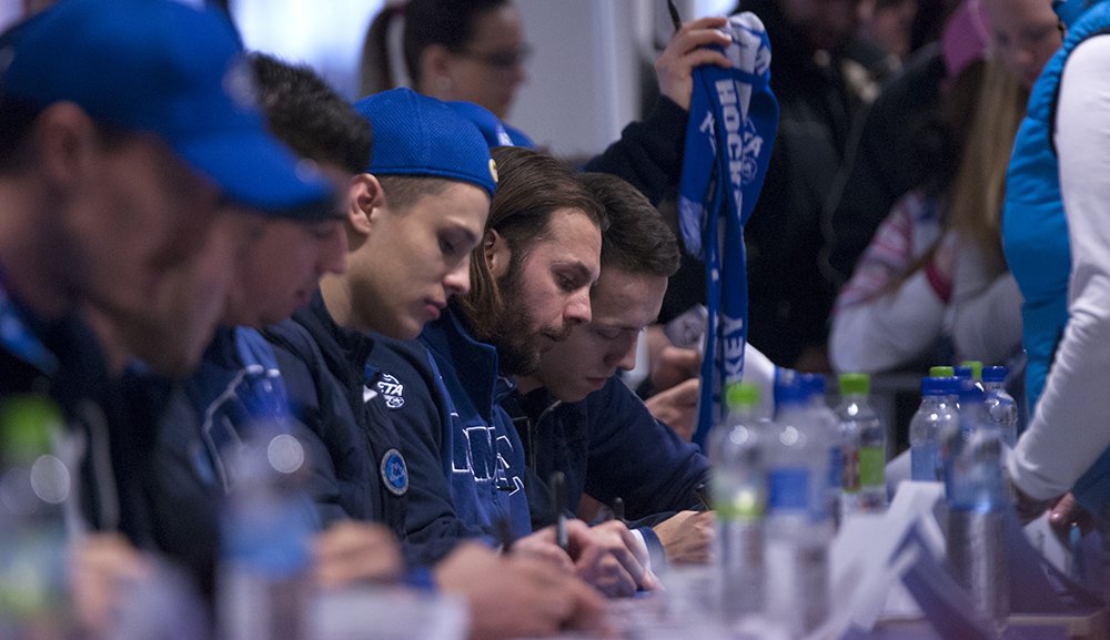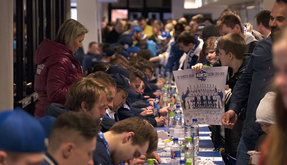 B r n o – Ještě než vyjeli komeťáci na led ke svému poslednímu utkání sezóny 2015/2016, dopřáli si pořádnou rozcvičku. Přes dvě hodiny dlouhou autogramiádu svým věrným fanouškům. Všichni byli seřazeni ve štrůdlu v DRFG Areně pod tribunami C a D. Protože byl zájem o podpisy enormní, byla autogramiáda z plánované hodiny a půl prodloužena. Hráči, co museli do výstroje k utkání, odcházeli dříve, fanouškům se však i nadále věnovali borci, kteří do tradičního zápasu proti Fan Klubu nezasáhli. Fotografie si můžete prohlédnout v naší galerii.