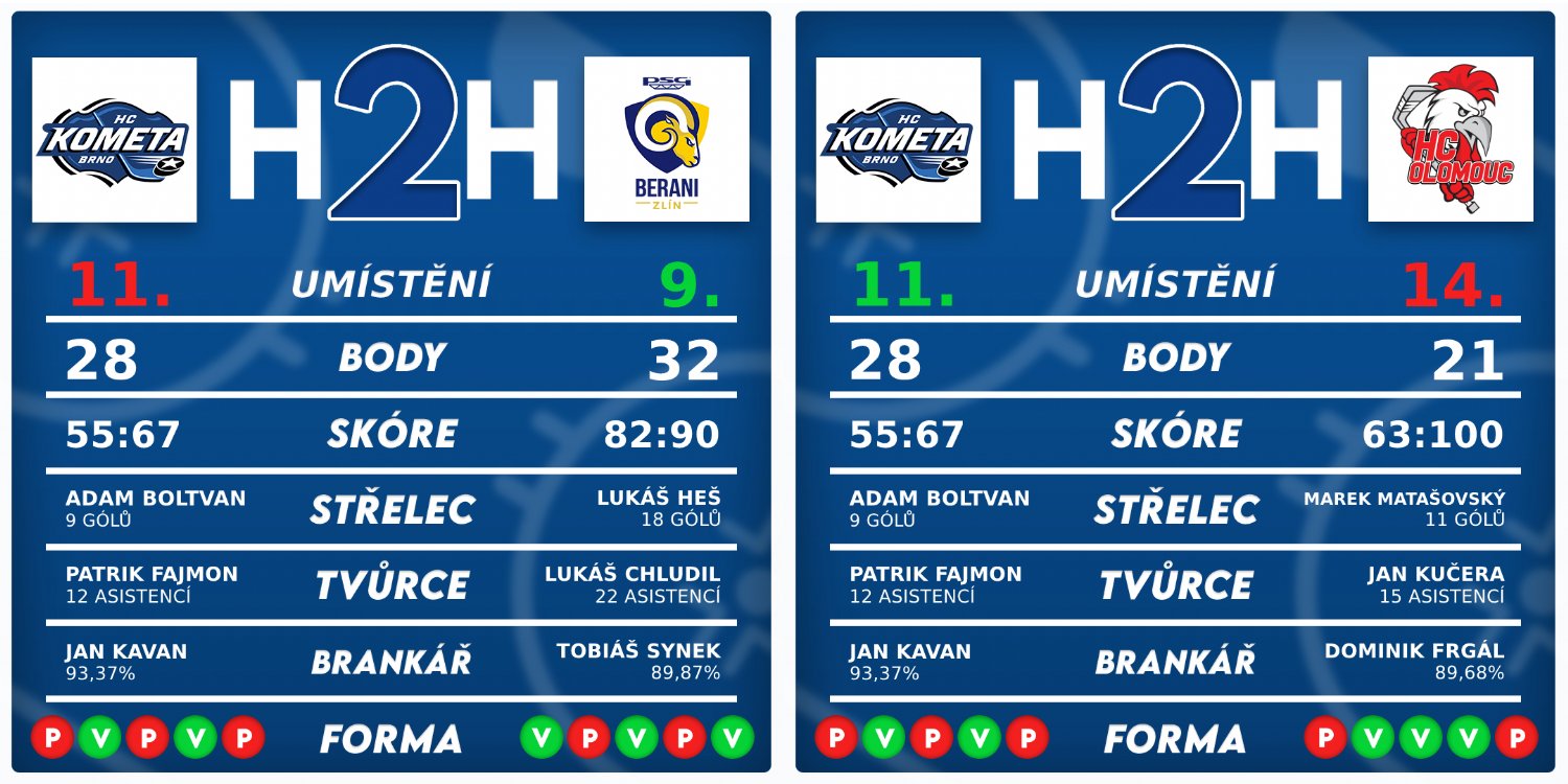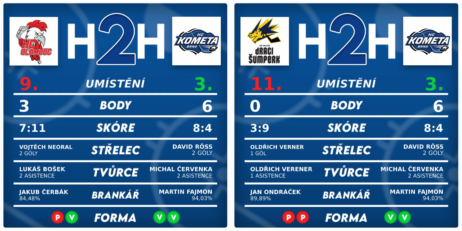 Juniory čekají odvetná utkání. Se Zlínem se utkali Brňané v polovině října a po úspěšné přestřelce 4:3 z toho byly 3 body. V Olomouci už to tak bohaté nebylo, ovšem modrobílým to vadit nemuselo, po výhře 1:0 si z Hané odvezli všechny body. Na obě výhry budou chtít komeťáci jistě navázat, pomoci by jim dle všeho mohl už i Ivo Sedláček, jenž se vrátí po dlouhém zranění ruky.