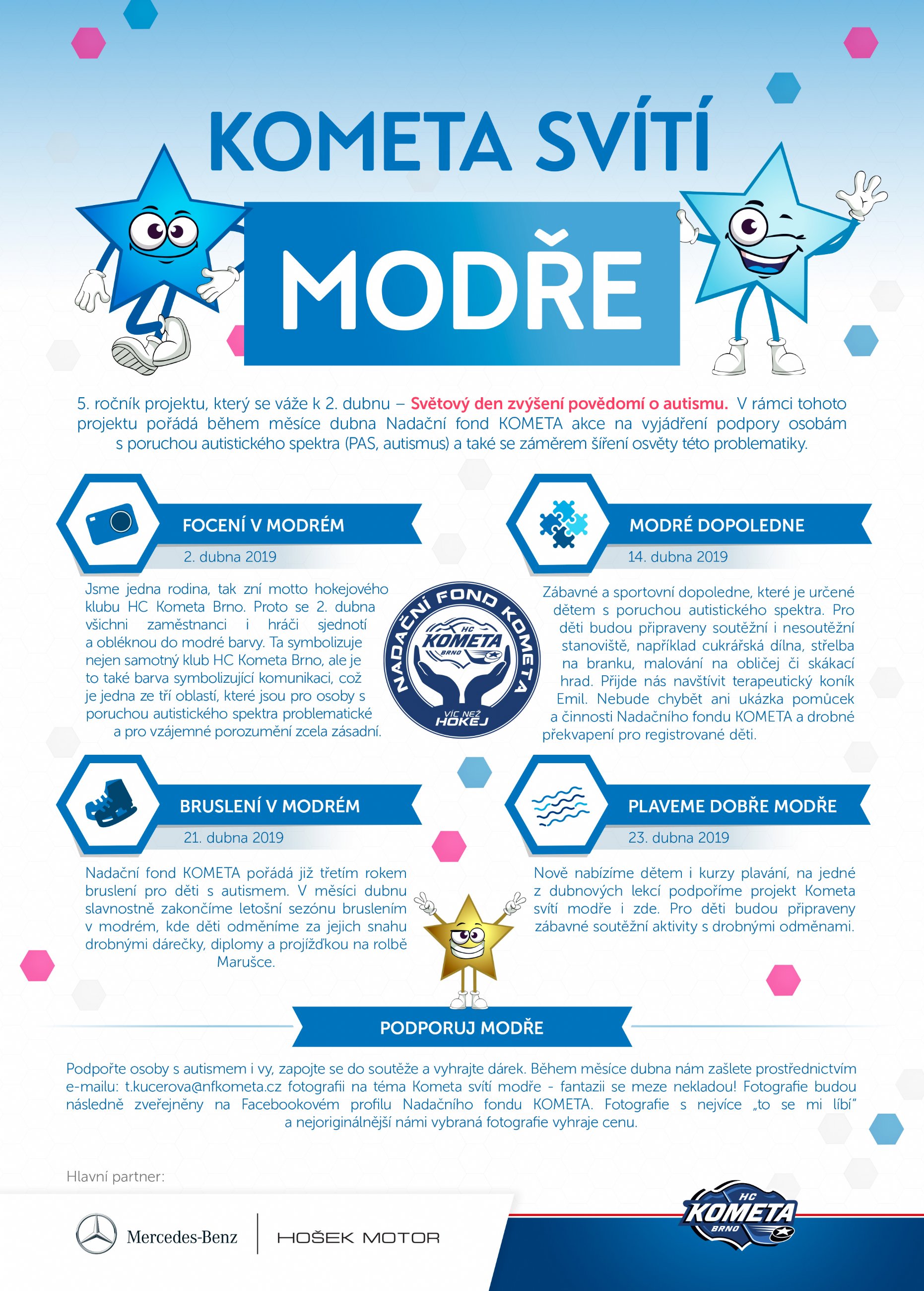 Jednou z nich je FOCENÍ V MODRÉM. Jsme jedna rodina, tak zní motto hokejového klubu HC Kometa Brno. Proto se 2. dubna všichni zaměstnanci i hráči sjednotí a obléknou do modré barvy. Ta symbolizuje nejen samotný klub HC Kometa Brno, ale je to také barva symbolizující komunikaci, což je jedna ze tří oblastí, které jsou pro osoby s poruchou autistického spektra problematické a pro vzájemné porozumění zcela zásadní.