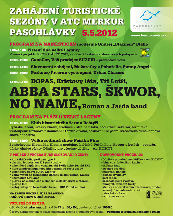Již v sobotu 5. května 2012 zahajuje turistickou sezónu ATC Merkur Pasohlávky. V minulosti se zahájení účastnili také hráči prvního týmu Komety Brno a fanoušci mohli získat ojedinělé suvenýry i při autogramiádě. Letos se svěřenci trenérů Venery a Oslizla zahájení turistické sezóny zúčastnit nemohou, protože si po zisku stříbrných medailí užívají zkráceného odpočinku, aby mohli včas začít přípravu na novou sezónu. Přesto všechny fanoušky Komety srdečně zveme na zábavný den, kde se budete moci pobavit nejen u koncertů známých kapel. Vezměte s sebou i děti, protože je pro ně naplánována celá řada zábavných soutěží. Kompletní program si přečtěte na přiloženém plakátu.
