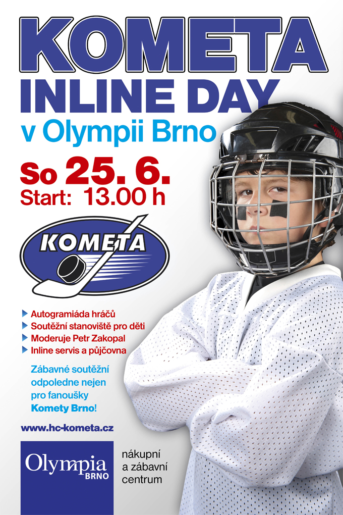 Kometa Inline day začne ve 13.00 hodin. Pestrost mu dodají také dvě vystoupení mažoretek LASSIES v místním amfiteátru (14.00, 15.30). Pokud jsou mezi vámi i tací, kteří se již nemohou dočkat, až začne hokejová sezóna, budete si u Olympie moci naživo prohlédnout tým Komety, který se zúčastní autogramiády.