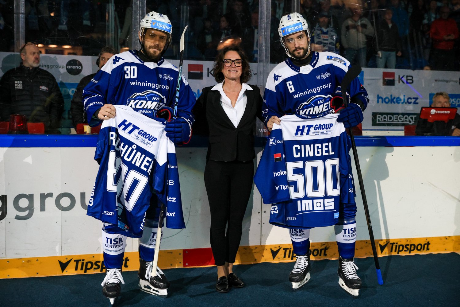Hana Cahová coby předávající symbolických dresů při letošním ceremoniálu (Tomáš Rachůnek – 600 utkání v TELH, Lukáš Cingel – 500 utkání v TELH). Foto: Vít Golda.