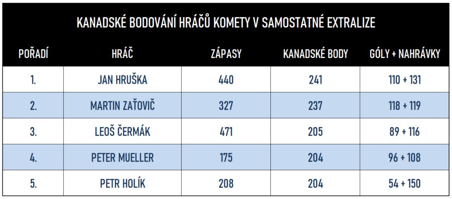 Od návratu Komety do extraligy v roce 2009 dosáhlo na 200 bodů v modrobílém dresu celkem pět hráčů. Na prvním místě je s 241 body brněnský odchovanec Jan Hruška. Ovšem to nejspíš nebude platit dlouho, současný kapitán Martin Zaťovič na něj ztrácí pouze čtyři body. Za několik dní pravděpodobně usedne na pomyslný trůn on. Zaťovič už se na podzim stal nejlepším střelcem Komety v samotné extralize.