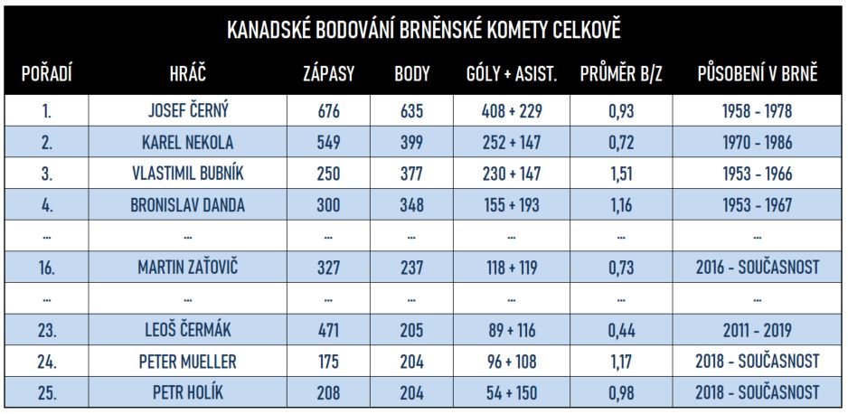 Na bronzové pozici se nachází bývalý kapitán Leoš Čermák s 205 body. Ovšem to se také brzy změní, neboť Petr Holík a Peter Mueller mají pouze o bod méně a nejspíš už v příštím zápase Čermáka přeskočí. Holík už je nejlepším asistentem Komety v extralize, jako první hráč také dosáhl na 150 asistencí v dresu Brna. Pokud budou členové prvního útoku pokračovat ve své bodové produkci, mohou se na konci sezony seřadit na prvních třech příčkách.