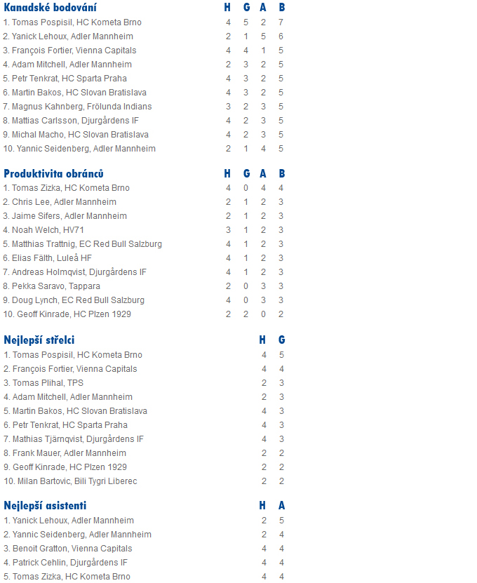 I n n s b r u c k – Základní skupiny přípravné soutěže European Trophy pomalu dobíhají do své půlky, proto je čas podívat se, jak si vedou nejen všechny zúčastněné týmy, ale i jednotlivci. Kometa má navíc na vrcholu hned dva zástupce. Kanadské bodování vede Tomáš Pospíšil a v obráncích je na tom zatím nejlépe Tomáš Žižka.