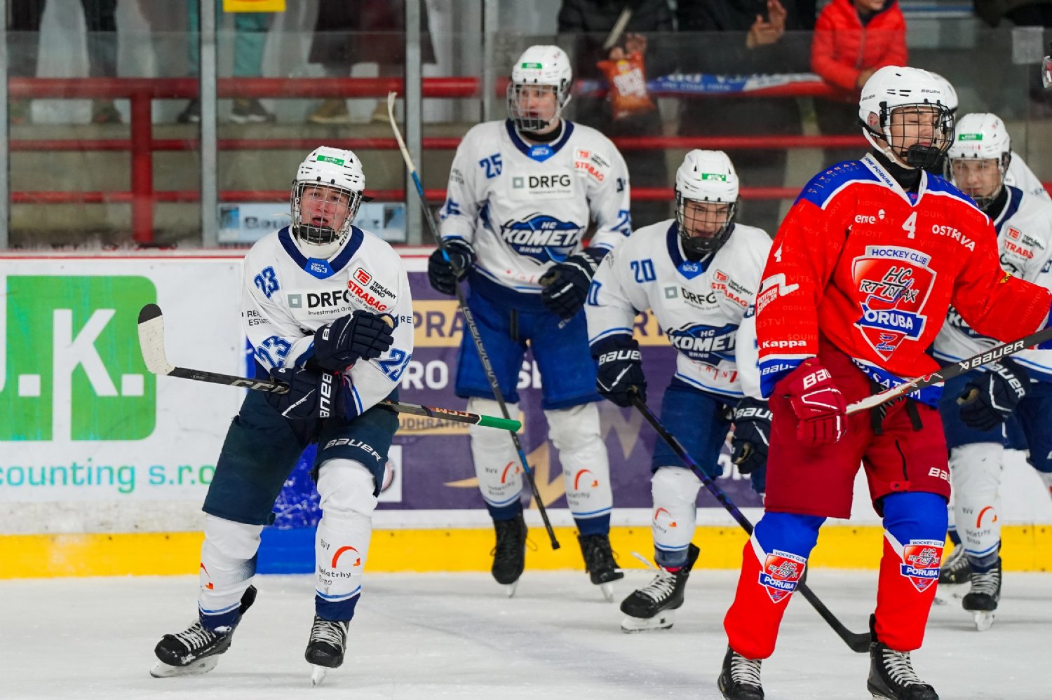 Výprava juniorů do Ostravy odstartovala pátečním kláním s Porubou. Brněnští mladíci se rychle ujali vedení, pořádně to ale rozbalili až ve druhé třetině, kdy brankáře soupeře přemohli hned čtyřikrát. I když Porubané snížili, náskok Brňanů, který ještě umocnil Veselský, byl nedostižný. Kometa tak po utkání do autobusu naložila společně se zavazadly tři body za výhru 6:2.