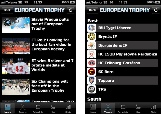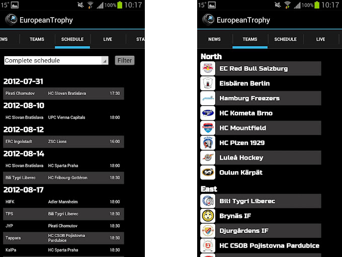 Android. Webové mobilní rozhraní i mobilní aplikace obsahují veškerý obsah jako klasické internetové stránky European Trophy, tedy živé přenosy z utkání, reportáže ze zápasů, statistiky, plán zápasů a novinky.
