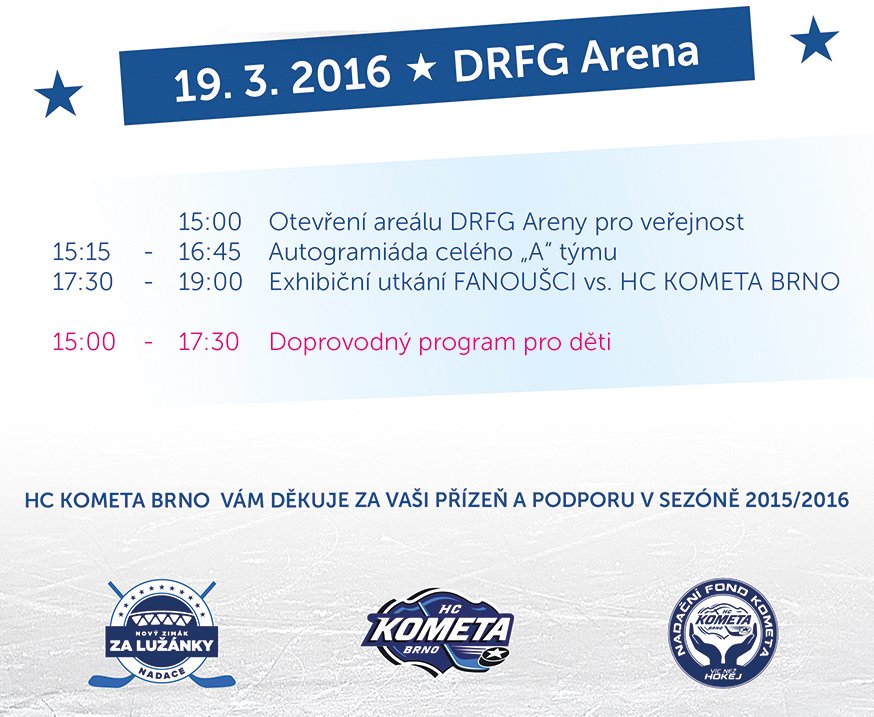 B r n o – První tým Komety bohužel podlehl v předkole play-off chomutovským pirátům, což pro něj znamenalo konec sezóny. V sobotu 19. března uspořádáme tradiční rozlučku se sezónou. Jak bývá zvykem, hokejisté Komety se při ní utkají s výběrem Fan Klubu Komety a těšit se můžete i na autogramiádu celého „A“ týmu. Brány se otevřou v 15 hodin, autogramiáda začne pod tribunami C a D o patnáct minut později. Utkání proti Fan Klubu Komety bude začínat v 17:30 hod. Všichni jste srdečně zváni!