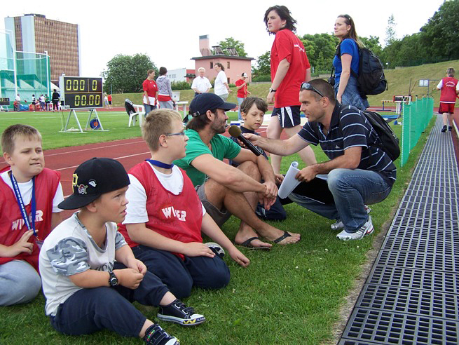 Pak se děti rozběhly na svá soutěžní stanoviště a věnovaly se jednotlivým disciplínám. Zápolilo se například v hodu míčkem či kuželem, skoku do dálky nebo bězích na různě dlouhé tratě. V improvizovaném press centru – na trávě vedle běžecké dráhy – si Radek Dlouhý povídal s dětmi, které právě dokončily běh. Ty na něj měli spoustu zvídavých otázek.