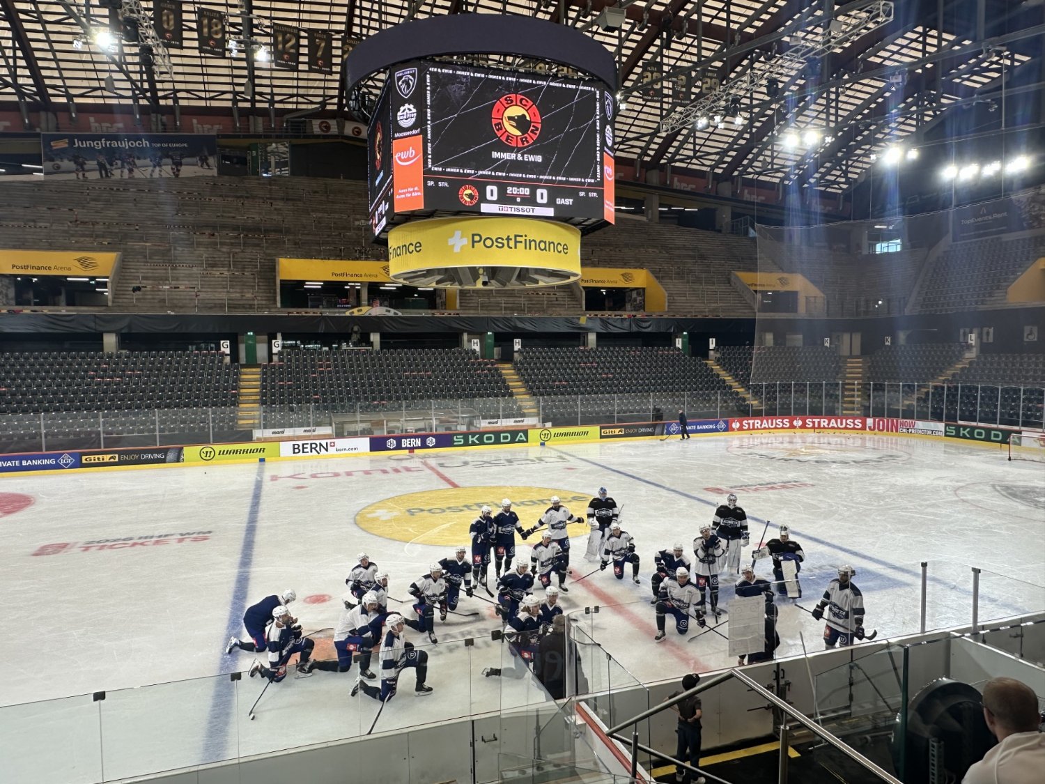 🕰 15:00 Hokejisté jsou již v Post Finance Areně, která pojme více jak 17 tisíc fanoušků. Probíhá příprava na sucho, v 16:00 jdou hráči na led.