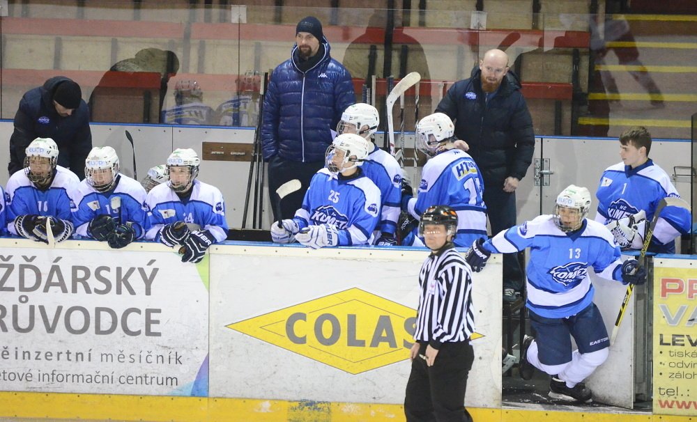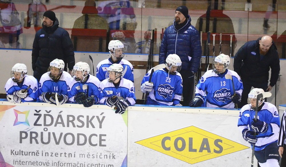 V první části utkání nedávali bruslařsky aktivnější hosté domácím Plamenům moc šancí k vystřelení. Do gólové situace se ale dostal Jaromír Pytlík již na samém začátku dvacetiminutovky, jenže na brněnského gólmana Lukáše Dostála byl krátký. Více výraznějších šancí domácích až do zazvonění sirény k vidění nebylo. Modrobílí ve druhé minutě opět obsadili žďárskou třetinu, ale tentokrát se na střídačku vraceli s úsměvem na tváři. Puk propasíroval přes domácího Tomáše Kulicha brněnský útočník Maxim Čajkovič . Zápas se přehoupl do sedmé minuty a Kometa po brance Adama Garajského vedla už 2:0. Žďár se marně snažil snížit dvoubrankové manko, jenže zdatnější Brňané žďárské dorostence s přehledem přebruslili a nepouštěli je ke své bráně. Jihomoravský tým kladl nápor na mladé Plameny až do samého konce třetiny a stihl pohrozit i v posledních sekundách.