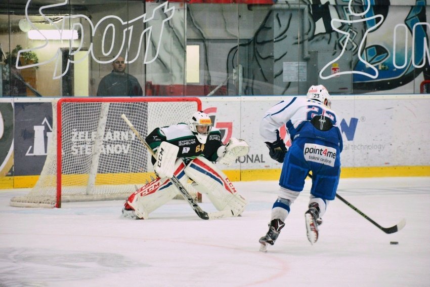 Druhá přesilovka hostů znamenala druhou branku. Na levém kruhu dostal krásný pas Filip Hauzr, který z první trefil přesně prostor u bližší tyče – 0:2. Domácí měli i nadále více ze hry, přesto však potřetí inkasovali. Po chybě v obranném pásmu Komety se k puku dostal Radek Prošek, jenž si vybruslil mezi kruhy a poté švihem zamířil mezi Krčkovy betony. Do konce první části mohl snížit Škrvně, jenže brankáře si po akci na pravé straně obhodit nedokázal.
