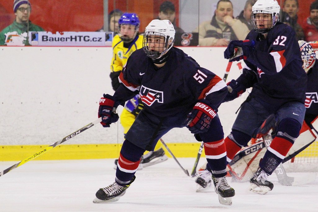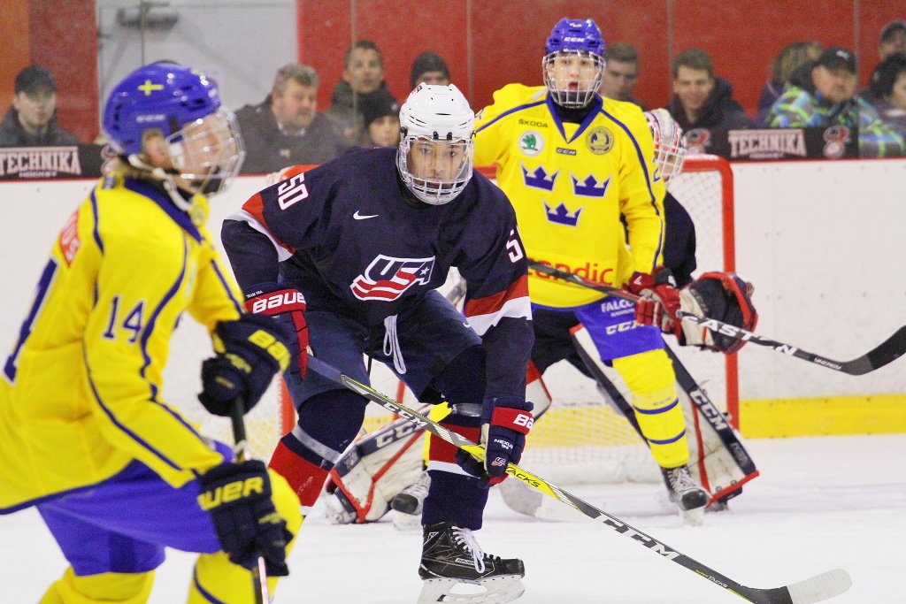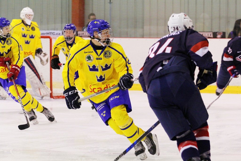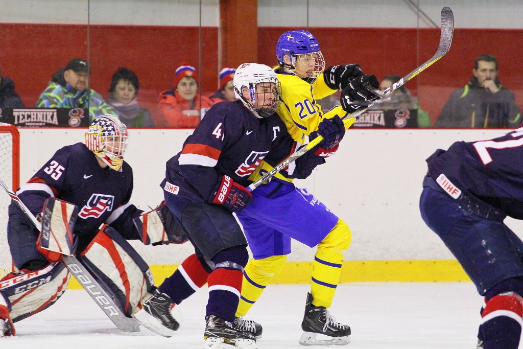 Poslední třetina začala podobně jako druhá přesilovou hrou, v té se ovšem nikdo z amerických hráčů prosadit nedokázal. Hru zpestřila téměř minutu a půl dlouhá hra čtyř proti čtyřem, když nejprve fauloval Janicke a poté Höglander. Následujících několik minut bylo pro diváka velmi nezáživných, protože oba týmy měly problémy s přechodem do útočného pásma. Následně hrál tým USA přesilovou hru, jenže ani svoji šestou početní výhodu nedokázali Američané využít. Toho mohli hořce litovat, když si vzápětí střelu Filipa Hasy srazil brankář Karki do brány a modrožlutí se poprvé v zápase ujali vedení. Ani závěrečný tlak při hře bez brankáře už Američanům nepomohl a Švédové tak mohli v prvním utkání slavit první výhru.