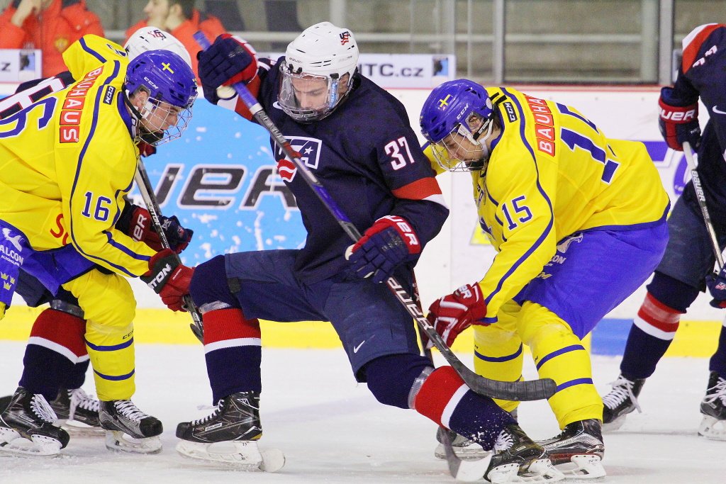 Švédové zahájili druhou periodu přesilovou hrou, protože se na konci první nechal vyloučit Weiss. Modrožlutí ovšem přesilovku nevyužili, naopak následoval trest pro střídačku za příliš mnoho hráčů na ledě. Ve 29. minutě se situace se špatným střídáním opakovala i na druhé straně, což znamenalo přesilovou hru pro švédské hráče. Tuto přesilovku ještě Američané ubránili, jenže po následující potyčce mezi Kingem a Berggrenem a sekání Samuelssona následovala téměř minutová hra čtyř proti třem. Tu už seveřané využili, střelou od modré skóroval Adam Bokvist. Vyrovnaný stav ovšem netrval více než půldruhé minuty, puku se zmocnil Oliver Wahlstrom a vrátil USA vedení. Minutu na to už měli hráči Spojených států možnost jednogólový náskok navýšit, Janicke se ovšem proti gólmanovi Lindbomovi neprosadil. Ve 37. minutě ještě zvládli Švédové dorovnat po akci Höglandera, jehož kličku dorazil za záda Karkiho Samuel Fagemo. Za stavu 2:2 se tedy dala očekávat zajímavá třetí část.