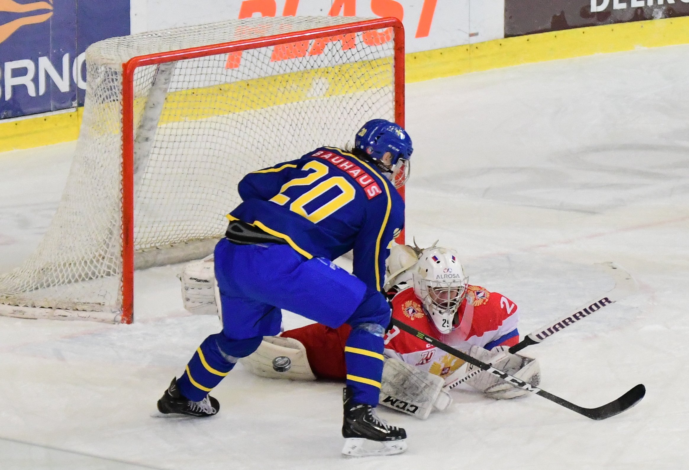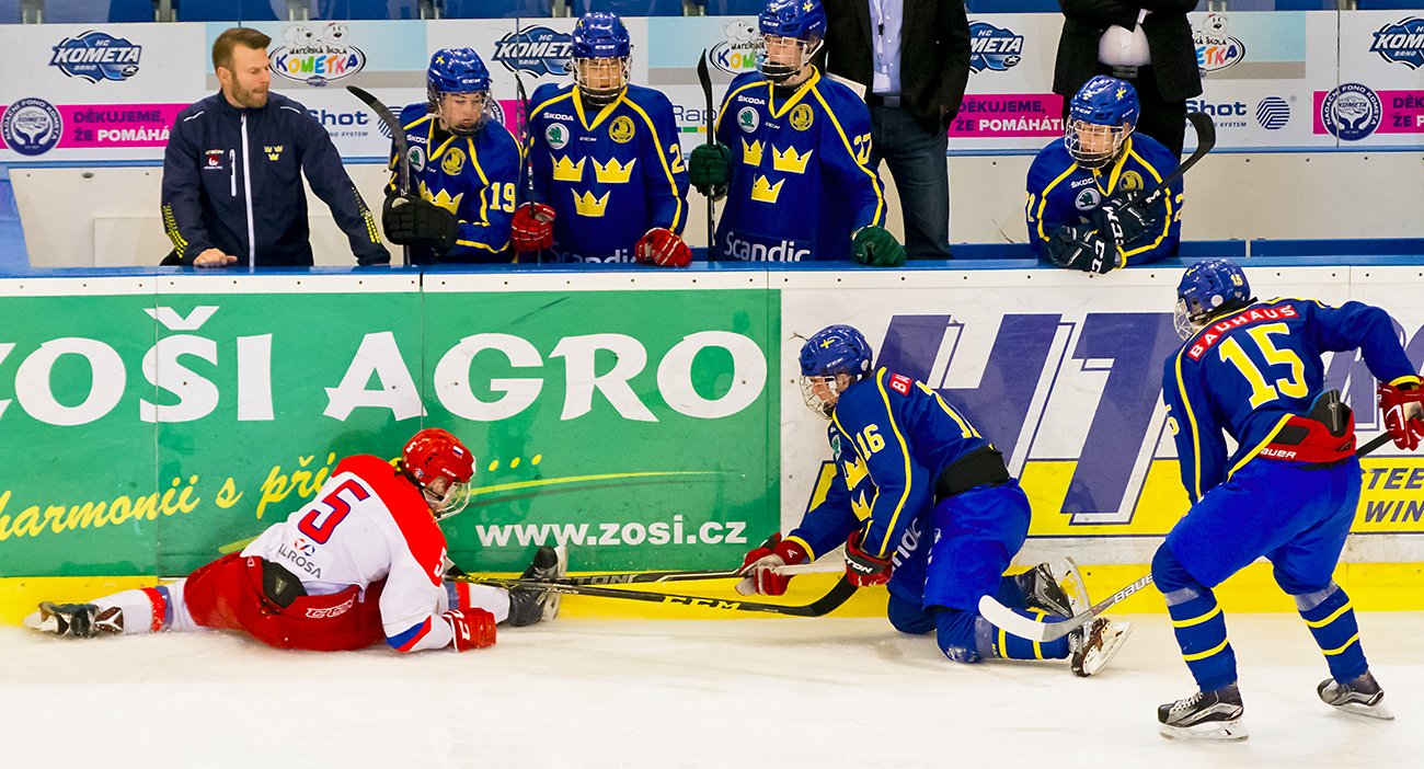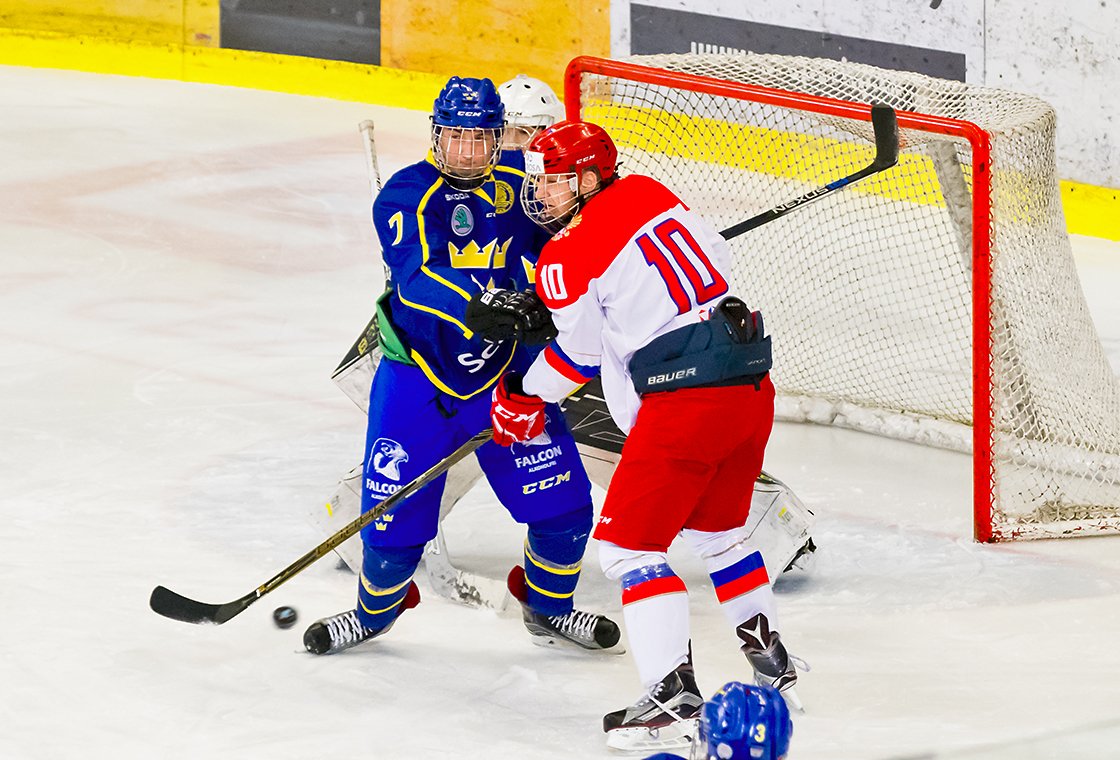 Druhou dvacetiminutovka začala sborná skvěle. Hned po patnácti vteřinách hry se k odraženému puku na brankovišti dostal Vladislav Kotkov a přesným bekhendem nasměroval kotouč nad beton brankáře Švédů. Na druhé straně mohl snížit Švéd Pasic, ale Isajev jeho ránu pokryl. Šance si poté vypracovali hlavně Rusové. Nejprve Solopanov dostal přihrávku na brankoviště, ale Hedlund jeho pokus k tyči skvěle vyrazil. Následně ujel obráncům Tre Kronor Chovanov, který byl faulován a k dispozici dostal trestné střílení. Ruský útočník si najel zprava a zkusil brankáře Švédů překvapit ranou zápěstím na vyrážečku, ovšem neuspěl. Chovanov měl svou šanci i při hře, když se proháčkoval před branku, nicméně Hedlund opět pohotově zasáhl. Zanedlouho vznikla před brankou Švédů skrumáž, v níž nejrychleji zorientoval Jegor Sokolov a důrazem dotlačil puk za brankovou čáru. Za tři minuty předvedl skvělou akci talentovaný Alexander Chovanov, který se vymotal u mantinelu, obešel dva hráče a z mezikruží trefil bekhendem přesně pod lapačku brankáře Švédska. A talent ruského hokeje se ještě do konce druhé části dočkal hattricku. Alexander Chovanov se rozjel s pukem ve středním pásmu, přesprintoval beka a v akci 2 na 1 zvolil přesnou ránu na bližší tyč, která prosvištěla nad vyrážečku Hedlunda.