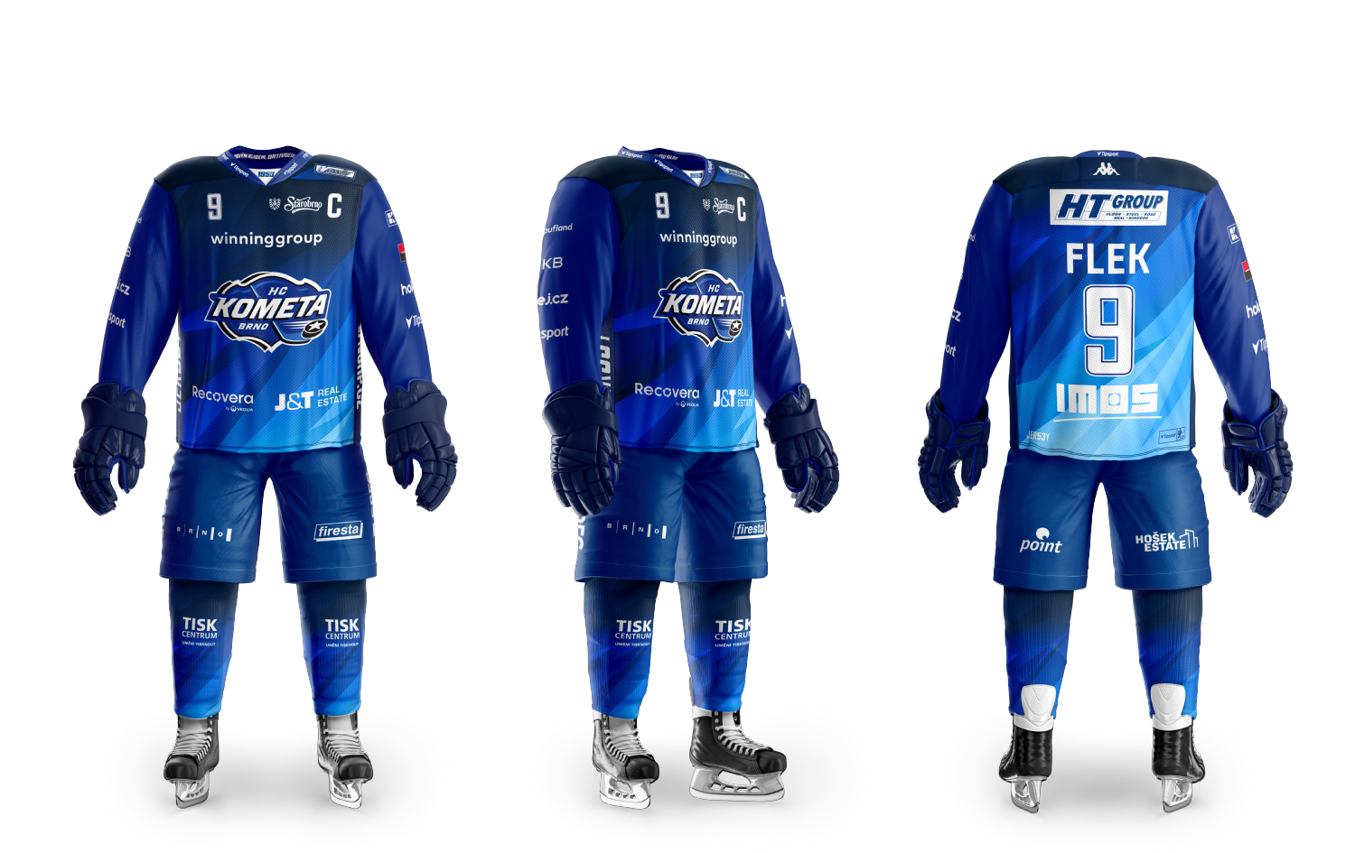 V modrých dresech budeme hrát: všechny domácí zápasy + venkovní utkání u soupeřů, kteří doma hrají ve světlé verzi dresů.